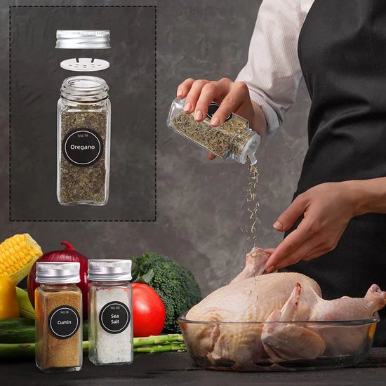 Overzichtelijke organisatie: Dankzij de herbruikbare etiketten houd je eenvoudig overzicht over je kruidenvoorraad, en met de diverse strooideksels kun je nauwkeurig doseren.