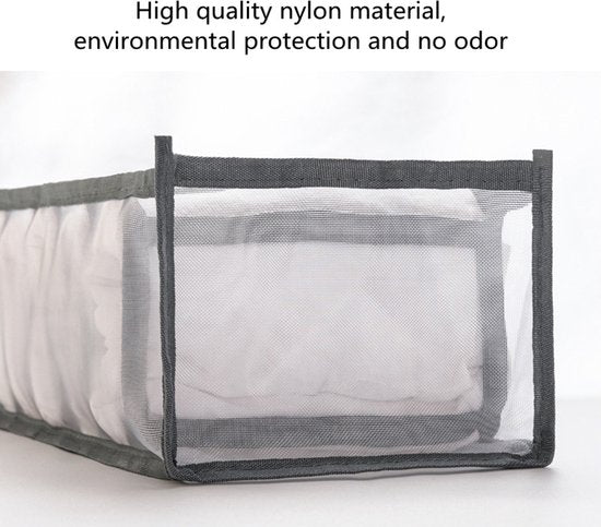 Door het gebruik van mesh nylon is de organizer vrijwel geurloos. Zo hoef je je geen zorgen te maken over vieze luchtjes die afkomstig zijn van het materiaal zelf. Bovendien is de organizer duurzaam, zodat je lang plezier kunt hebben van je organizer. Met de kledingorganizer bespaar je tijd en ruimte in je kledingkast. Zo houd je altijd overzicht en netheid in je kledingkast, voor al je dunne en lichte kleding.