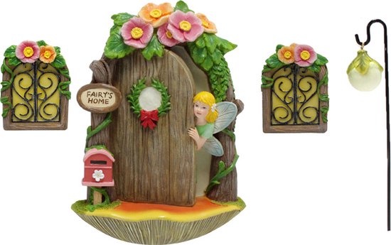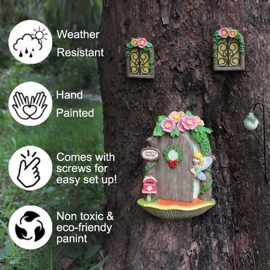 Dit boomhanger set bestaat uit een lichtgevend feeëndeurtje met twee bijpassende ramen, perfect voor het creëren van een magische sfeer in je tuin. De decoraties zijn gemaakt van duurzaam en weerbestendig hars, wat zorgt voor een lange levensduur, ongeacht de weersomstandigheden.