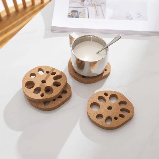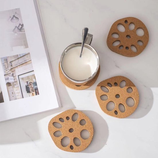 Deze Mooie onderzetters van kurk in de vorm van een lotuswortel,deze bieden niet alleen bescherming tegen de opdruk van glazen en kopjes maar zijn ook een leuke toevoeging aan elk interieur.