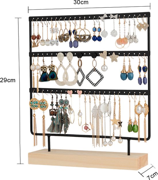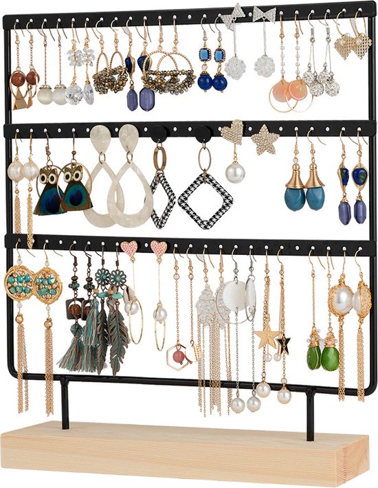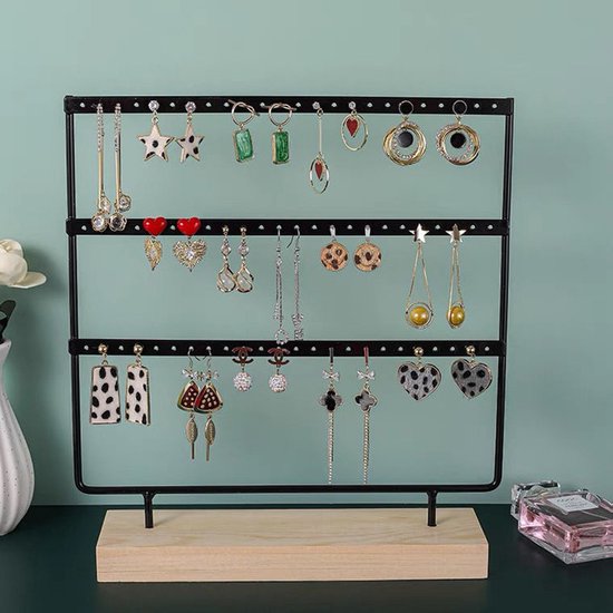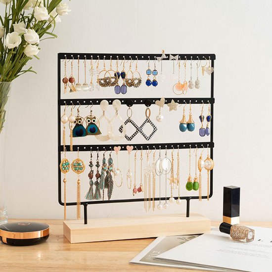Niveaus: Met 3 niveaus kan het rekje verschillende hoogtes of lagen hebben. Dit maakt het mogelijk om oorbellen van verschillende lengtes op te hangen en biedt een gestructureerde weergave.