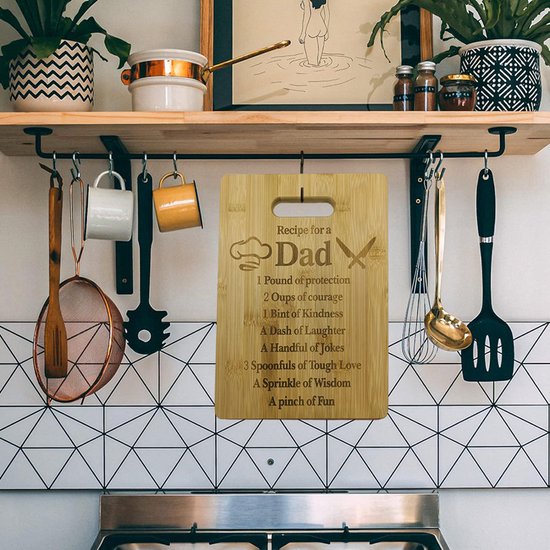 Verras een bijzondere moeder met deze multifunctionele bamboe snijplank, verfraaid met een hartverwarmend 'Recept voor een vader'. Ideaal als snijplank, serveerplank of keukendecoratie.