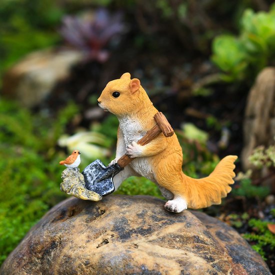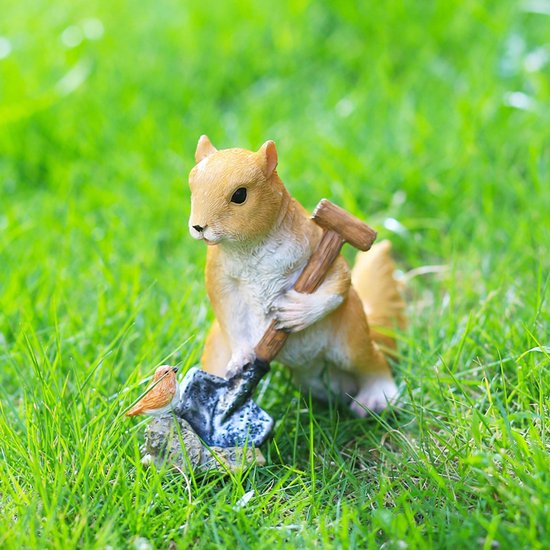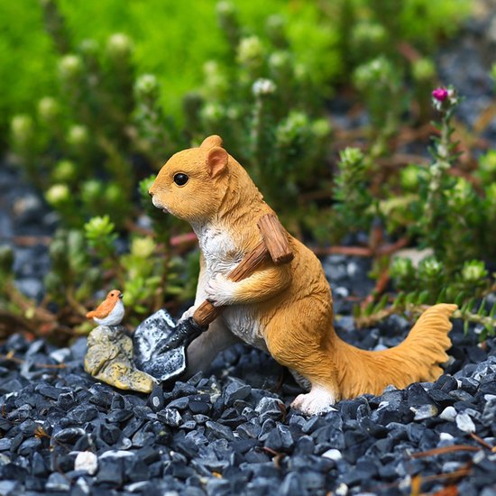 Tuinbeeldhouwwerk: Deze schattige, cartoonachtige eekhoorndecoratie is van de juiste grootte om in tuinen, buitenruimtes en andere locaties te plaatsen. Gemaakt van hars, kan dit ambacht ook worden gebruikt voor interieurdecoratie. Het is de perfecte aanvulling voor elke sprookjestuin.