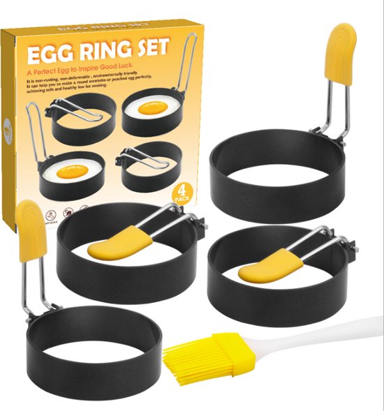 Deze bakvorm set bevat 4 stuks eierringen en 1 grillrijborstels. Geschikt voor het maken van eiermuffins, mini-pannenkoeken, hamburgers, gebakken eieren.