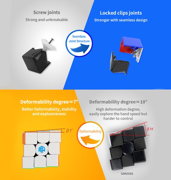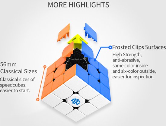 De GAN 356 RS is de opvolger van de GAN 356 R, een budget kubus van GAN. Deze kubus bevat geen magneten, maar desondanks dat draait deze kubus soepel en stabiel. In vergelijking met de GAN 356 R, bevat deze kubus GES-nuts (de gele). Ook heeft deze het welbekende honeycomb (honinggraat) design op de contactoppervlakten van de kubus, wat zorgt voor een goede verdeling van de lubricant(en) die u kunt gebruiken om de kubus te smeren. Daarnaast zorgt het ook voor het soepele draaien van de kubus. Voor beginners is deze kubus dus zeker een aanrader!