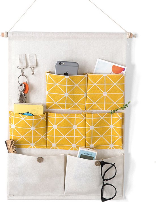 Houd je huis opgeruimd en georganiseerd met deze stijlvolle katoenen wandorganizer in zonnig geel. Een ideale mix van functionaliteit en decoratie!