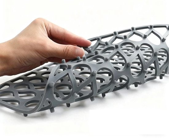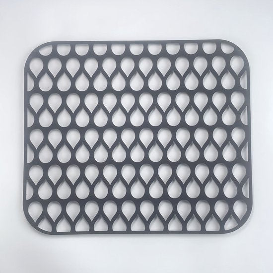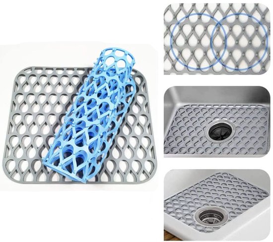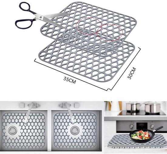 Gootsteen afvoermat die je spoelbak beschermt tegen krassen en verstopping; maat 35 x 30 cm, grijs. Flexibele mat met open structuur zorgt voor vrije doorloop van water en voorkomt dat servies rechtstreeks op de gootsteen staat.