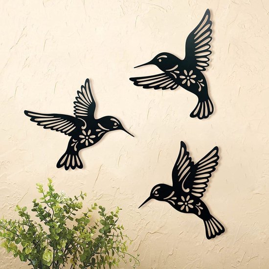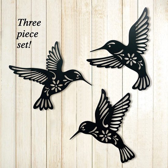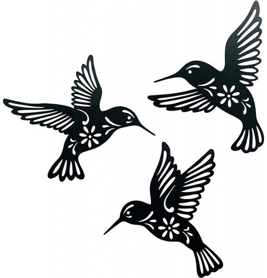 Geef uw tuin of interieur een elegante touch met deze prachtige driedelige set kolibrie wanddecoraties van hoogwaardig smeedijzer. De stijlvolle zwarte silhouetten zorgen direct voor een sfeervolle uitstraling en brengen een gevoel van rust en natuur naar iedere ruimte. Dankzij het eigentijdse en subtiele ontwerp passen deze metalen vogels uitstekend bij zowel moderne als landelijke tuinen en interieurs.