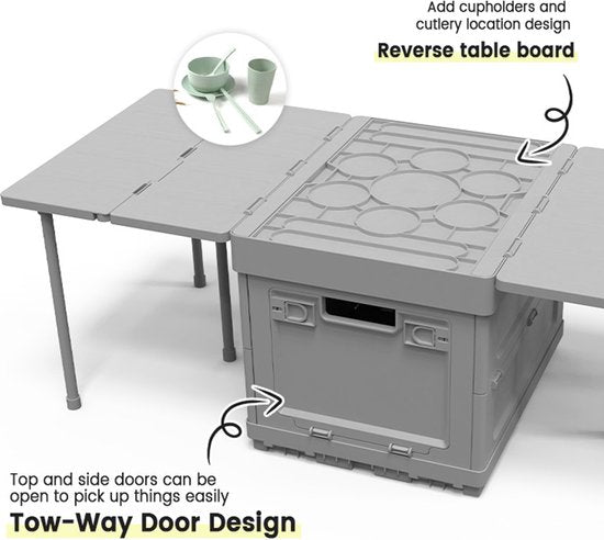 Handig tijdens buitenactiviteiten: Het zijdeurontwerp en de mogelijkheid om als tafel te dienen, maken het product ideaal voor kamperen, picknicken en andere buitenactiviteiten.