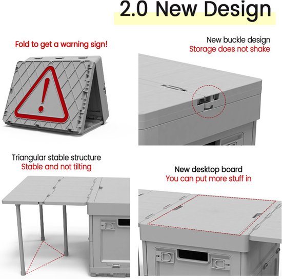 Kortom, dit veelzijdige product biedt een handige en duurzame oplossing voor het opbergen van kleding, terwijl het ook dienst kan doen als tafel en waarschuwingsbord. Het is ideaal voor buitenactiviteiten en biedt gemak, veiligheid en draagbaarheid.
