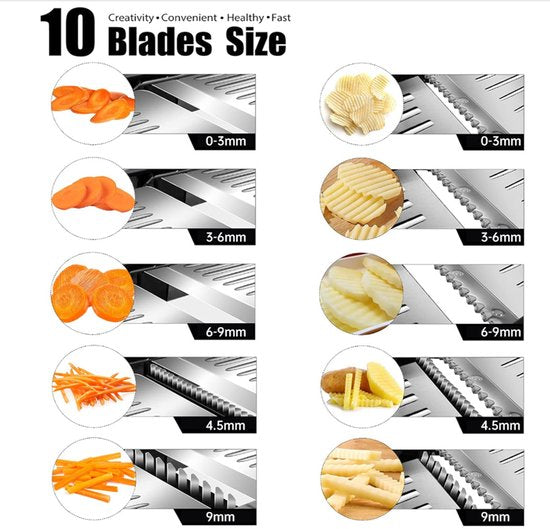 - 1x Mandoline groentesnijder (met 10 verwisselbare bladen)