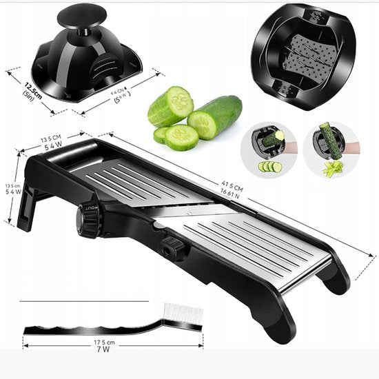 Multifunctionele mandoline groentesnijder voor snel en gelijkmatig snijden van groenten en fruit; verstelbare snijdikte en 10 verwisselbare RVS-bladen, afmeting circa 41 x 16 x 12 cm, zwarte kunststof behuizing.