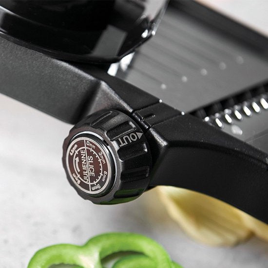 - Verstelbare snijdikte (0–9 mm) waardoor je dunne plakjes, julienne en wafelfrites maakt met één apparaat.