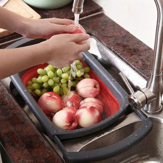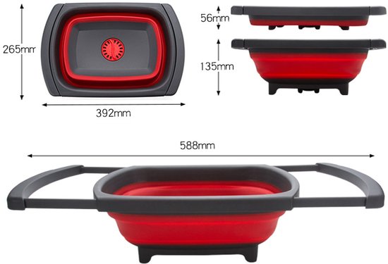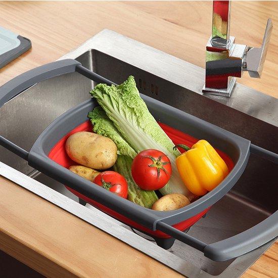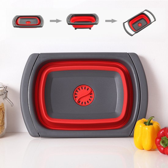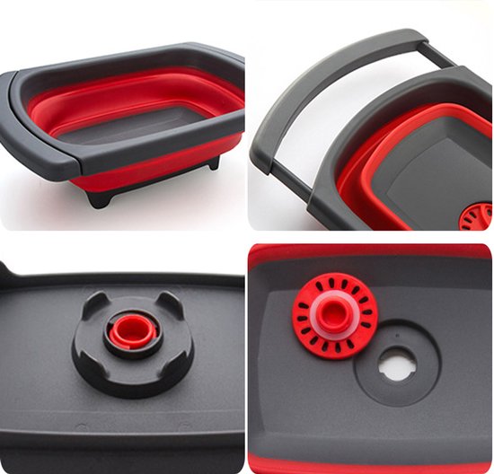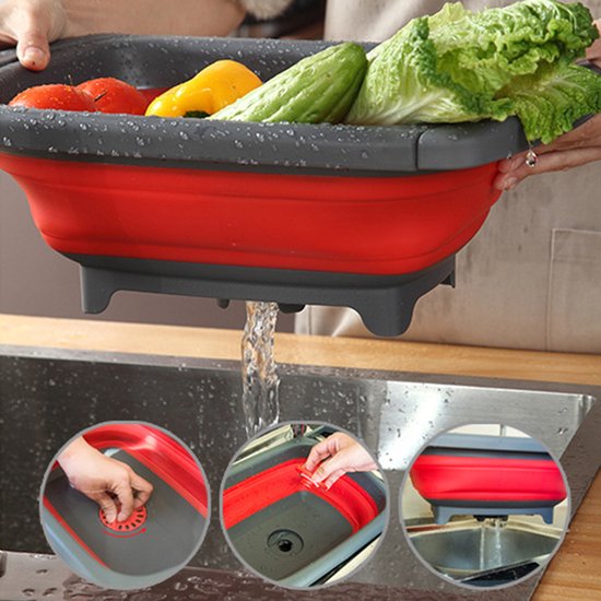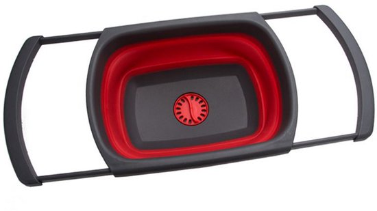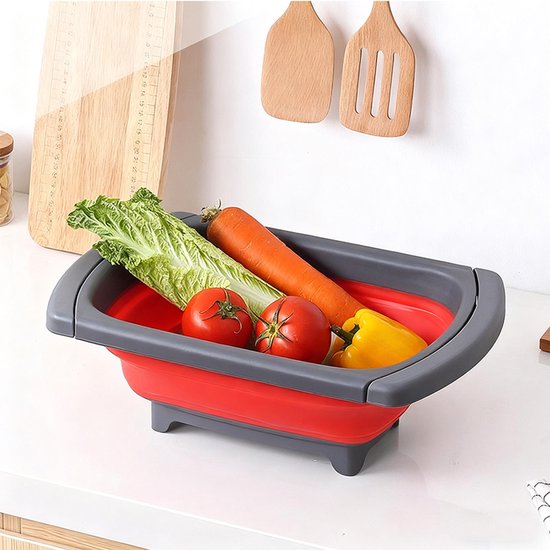 Opvouwbare wasbak voor in de keuken: handig om groenten te wassen of af te spoelen en eenvoudig op te bergen. Compact opvouwbaar tot 56 mm, uitgeklapt 39 x 26 x 13,5 cm, kleur rood/grijs.