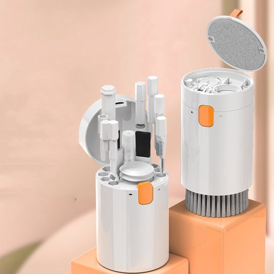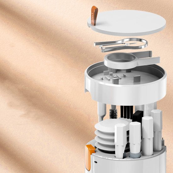 Ontdek de ultieme oplossing voor al uw schoonmaakbehoeften met onze veelzijdige 20-in-1 reinigingsset. Deze set, ontworpen in een elegante witte kleur met een opvallende oranje knop, combineert functionaliteit met een stijlvol design. Perfect voor het reinigen van elektronische apparaten, toetsenborden, camera’s en meer, deze set biedt alles wat u nodig heeft in een compacte opbergdoos.