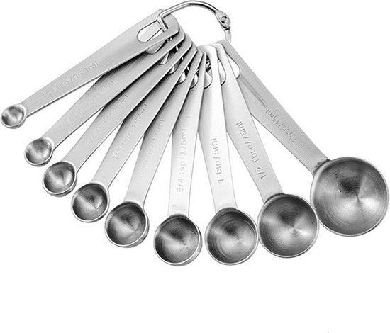 9-delige RVS Maatlepel set: Handig bij koken en bakken! Roestvrij staal, vaatwasserbestendig en makkelijk schoon te maken. Inclusief alleen gangbare maten en een handige verzamelring. Stoere en klassieke uitvoering, perfect als kerstcadeau!