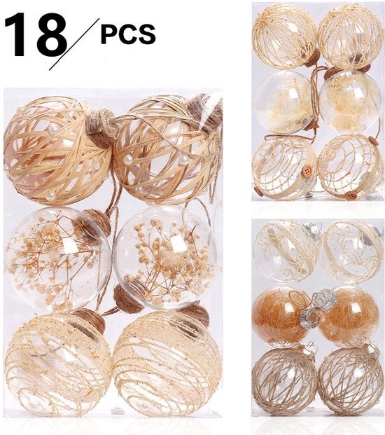 Set van 18 kunststof kerstballen in transparant en warme bruintinten, elk Ø 7,8 cm. Lichtgewicht en onbreekbaar met jutehangers en gevulde ornamenten voor een natuurlijke, herbruikbare kerstdecoratie.
