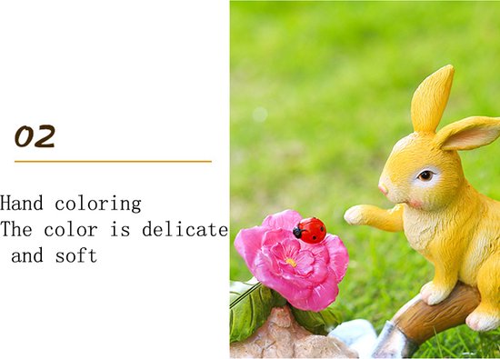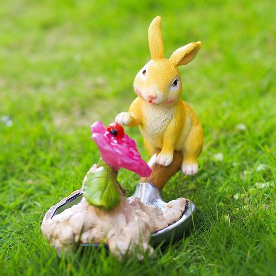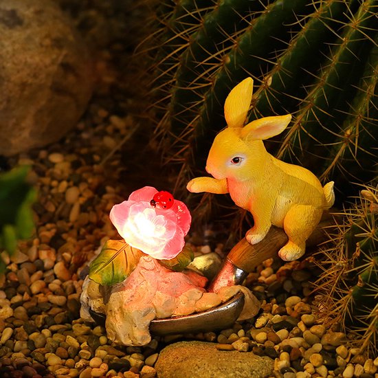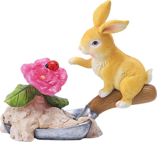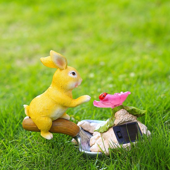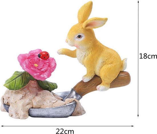 Het is gemaakt van duurzaam hars en heeft de vorm van een schattig konijntje.Het konijntje zit op een schep en kijkt omhoog naar de zon. De zonne-energie wordt opgeslagen in het zonnepaneel , waardoor de lamp automatisch aan gaat bij zonsondergang en uit gaat bij zonsopgang.