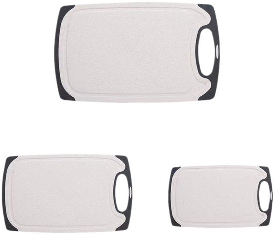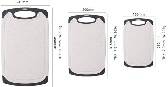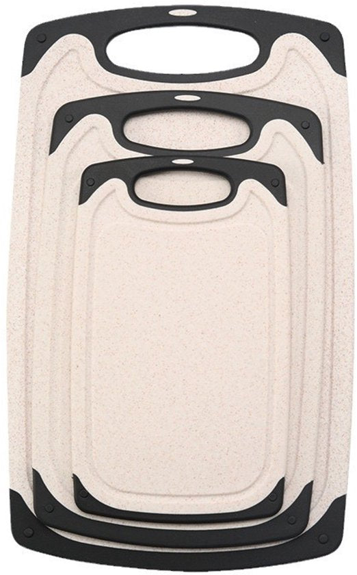 - 3 × snijplank (groot 245×400 mm, middel 200×315 mm, klein 150×250 mm)
