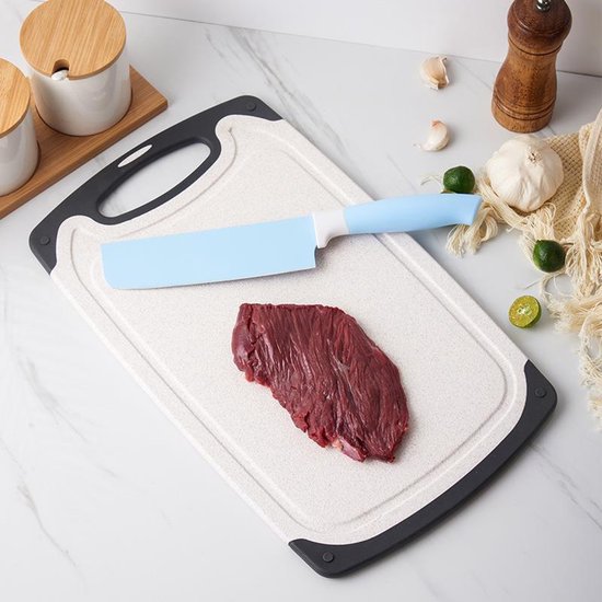 - Ingebouwde saprand (sapkanaal) vangt sappen op zodat je aanrecht droog blijft tijdens het snijden van vlees of fruit.
