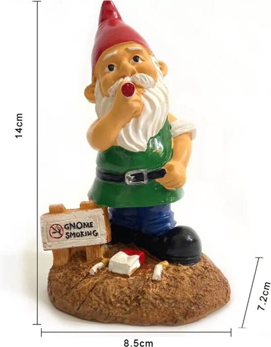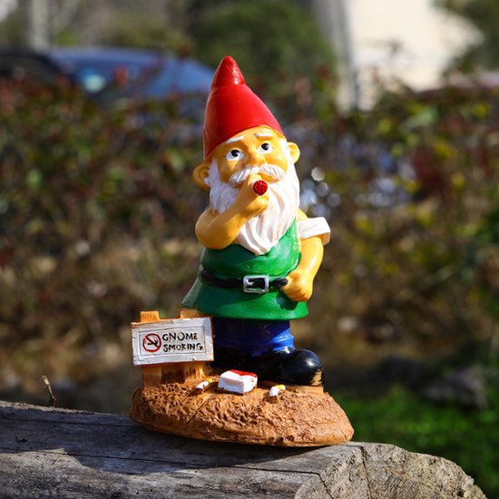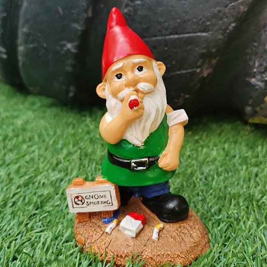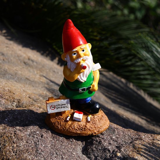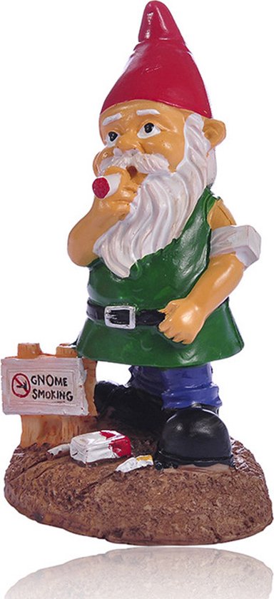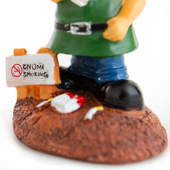 De tuinkabouter is afgebeeld met een verboden-rooksymbool, wat aangeeft dat hij een niet-roker is. Dit kan een leuke en humoristische manier zijn om een gezonde levensstijl te promoten of simpelweg een waarschuwing tegen roken in je tuin te tonen.