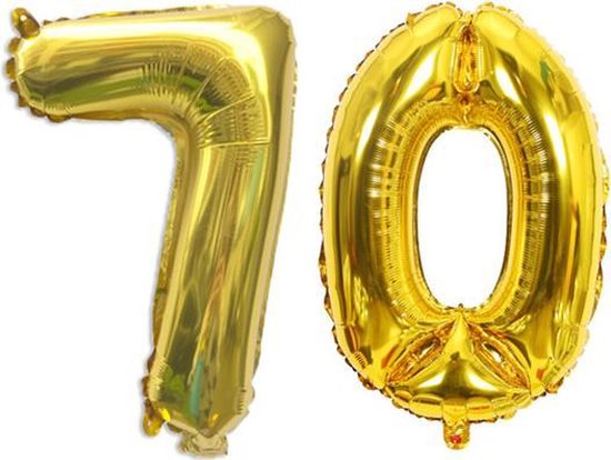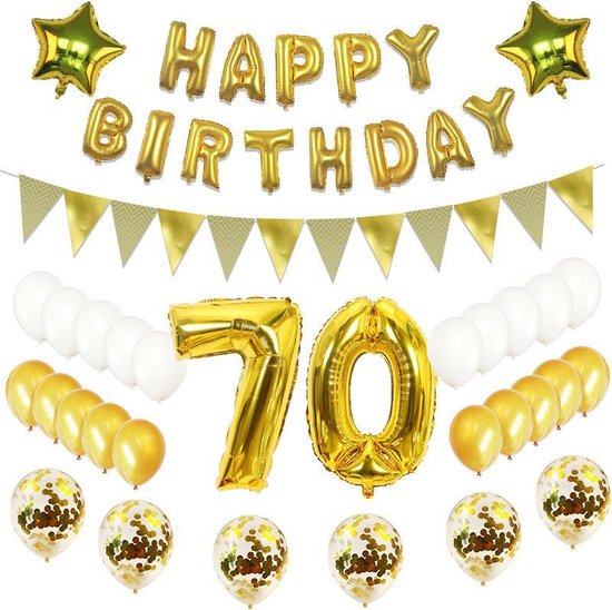Complete feestversiering voor een 70e verjaardag met goudkleurige Happy Birthday letters, opblaasbare cijfervormige ballonnen en een mix van latex- en confetti ballonnen; makkelijk op te hangen en direct inzetbaar.