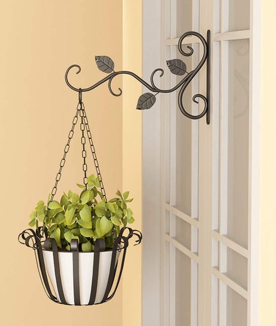 Deze stijlvolle wandbeugel, ontworpen met sierlijke bladvormen, is gemaakt van hoogwaardig metaal/ijzer voor een robuuste en duurzame constructie. Perfect voor het ophangen van bloempotten, hangmanden of andere decoratieve items, maakt deze beugel een prachtige toevoeging aan elke muur, schutting of pilaar.